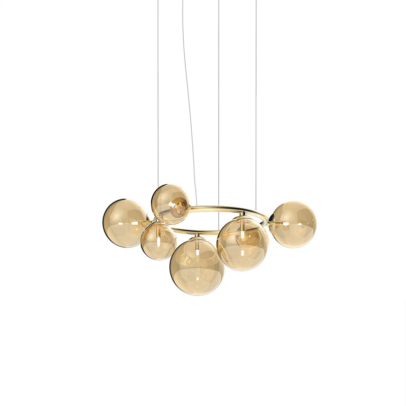 Indulge in luxury and sophistication with the Puppet Ring 7A Pendant Light from Vistosi. Featuring a frame of varying ring diameters adorned with crystals in multiple sizes, this ethereal light delicately blends crystal, smoked, amber and shaded white glass with gold and matte black nickel finishes. Perfect for grand spaces, the new configurations maintain the collection's elegant craftsmanship and technical finesse.