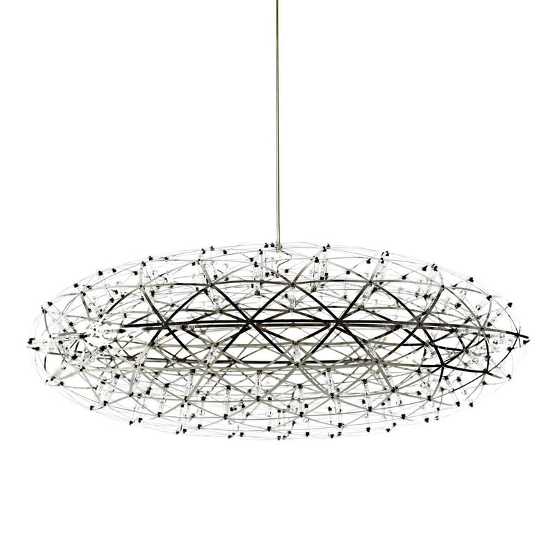 Inspired by the starry night sky, the Raimond II Zafu Suspended Lamp from Moooi creates a conversation-worthy atmosphere in any interior. Featuring delicate stainless steel bands and tiny LED lights, this modern pendant lamp creates a dazzling elliptical shape that effortlessly sparkles from above.