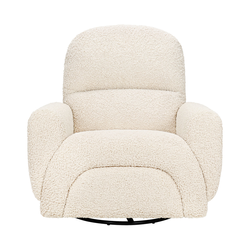 Experience ultimate luxury and comfort with the Rainbow Recliner and Swivel Glider from Babyletto. Its playful yet sophisticated design features a round silhouette and a smooth 360-degree swivel motion. With a hidden side lever, easily recline and relax on the plush teddy loop fabric, hand-upholstered for long-lasting style. Complete the look with the Kiwi Gliding Ottoman for a well-appointed nursery or lounge space.