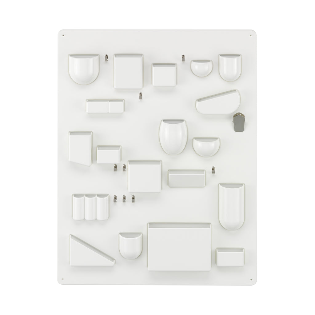 Uten.Silo is a storage system for use on the wall. Designed with containers of different shapes and sizes, metal hooks and clips, it brings order to offices, kitchens, workshops, bathrooms and children's rooms. Uten.Silo is available in the original size from 1969 – Uten.Silo I – as well as in the smaller version issued in 1970 – Uten.Silo II.