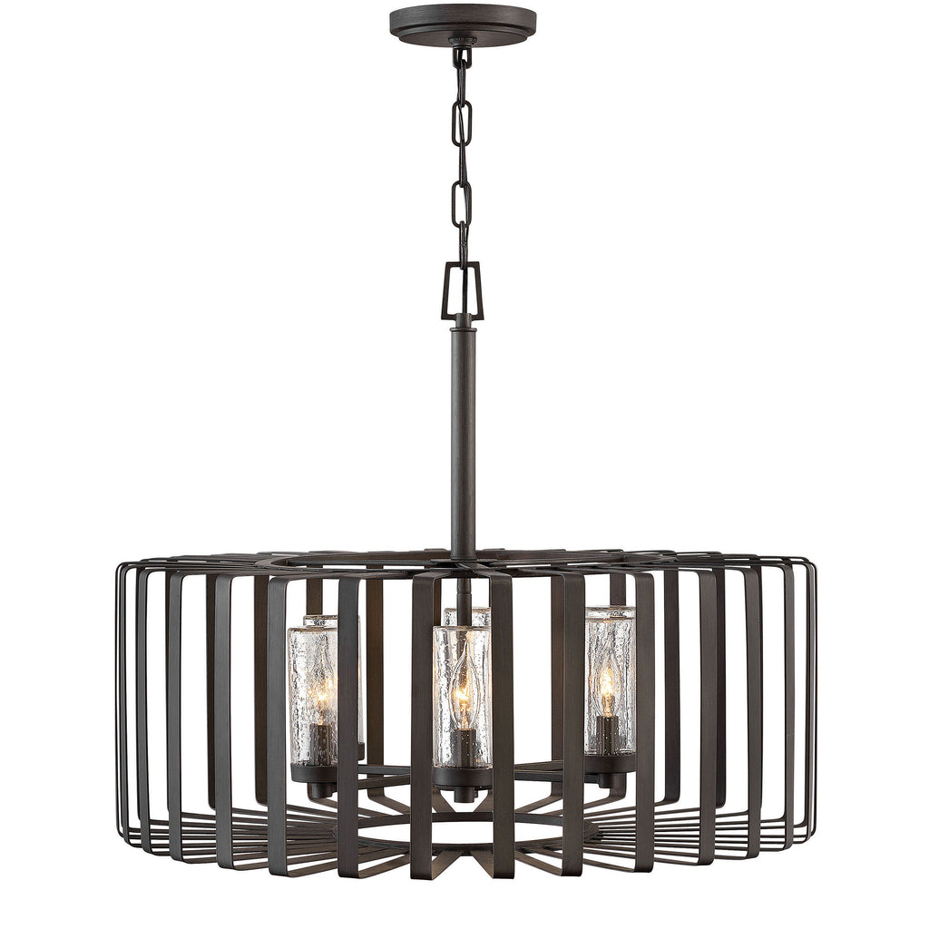 Reid uses an iconic profile featuring an airy, open cage to capture the center of attention. A candelabra with clear seedy glass columns highlights the transitional style, making it a modern mix of classic and contemporary. Weather-resistant metal with a Brushed Graphite finish complements any space, inside or out.