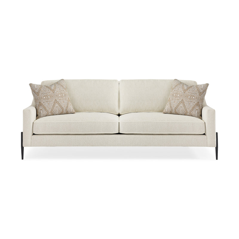 A perfect remix of modern and classic style, the Remix 2-Seater Sofa from Caracole is a marvelous and sophisticated centerpiece. Its timeless silhouette is given a fresh, contemporary update with a unique suspended frame, elegant metal flange detailing, and slim, tapered metal legs—all in a bold Black Iron finish. The sumptuously comfortable seat is upholstered to perfection in a delightful, textured fabric, while a decorative welt outlines the sofa's graceful slope, lending an element of organic harmony. A fusion of classic form and modern edge, it’s designed for luxurious, everyday comfort.