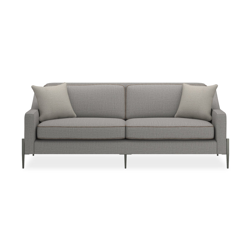 A perfect remix of modern and classic style, the Remix Sofa from Caracole is a marvelous and sophisticated centerpiece. Its timeless silhouette is given a fresh, contemporary update with a unique suspended frame and slim, tapered metal legs in a Smoked Stainless finish. The sumptuously comfortable seat is upholstered to perfection in a grey wool blend, while a contrasting tan leather welt outlines the sofa's graceful slope. A fusion of classic form and modern edge, it’s designed for luxurious, everyday comfort.