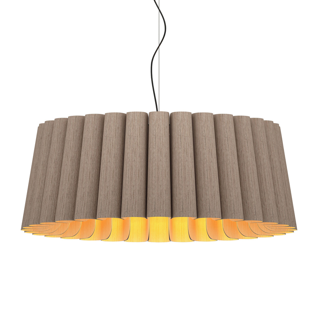 The Renata 80 Pendant light from Bruck Lighting exhibits a sustainable wood shade to add a natural aesthetic to your space. Colorful swirls of thin wood veneer create a visual statement highlighted by the warm glow of ambient light. The authentic wood grain is unique to each piece and every fixture’s character is nothing short of livable art. Station above a kitchen countertop or dining room table for a sculptural accent that is equal parts grounding and effervescent.