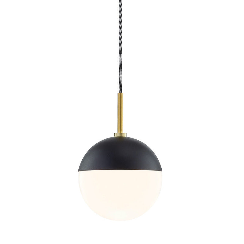 Boasting bold globes of milk glass less than half-covered by dark shades and contrasting finishes, Renee exhibits a mixture of drama, elegance, and fun. Gooseneck arms give it a classic feel, woven cords a contemporary one.