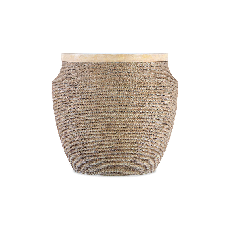 Elevate your space with the Retreat Round Side Table. Crafted with a Travertine Stone Veneer top, its earthy, organic design is both chic and sophisticated. The brown, beige, gray, and cream tones of the veneer harmonize with the brown rope wrapping. Levelers are thoughtfully included for a flawless fit.