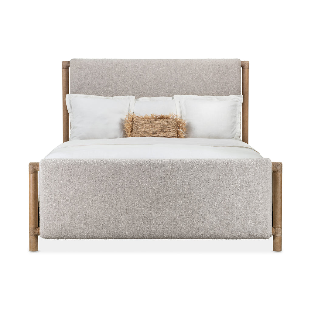 Escape to a serene oasis with Retreat Upholstered Panel Bed from Hooker Furniture. This beautifully crafted bed showcases the unique grain patterns of flat cut cathedral oak veneers, highlighting your choice of two transparent finishes: Dune and Black Sand. The woven cane panel bed and spa-inspired case pieces create a modern and relaxing atmosphere.