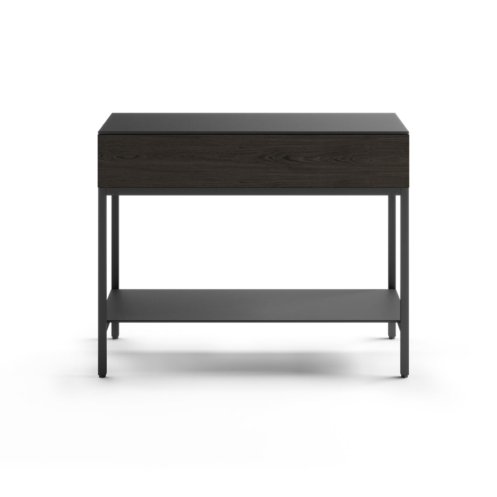 Crafted with satin-etched tempered glass, hardwood veneer, and powder-coated steel, the Reveal End Table is just the piece you need for your living room or bedroom. This end table fits many styles of decor and contains three different areas for storage, including a divided center storage space and a lower adjustable shelf.