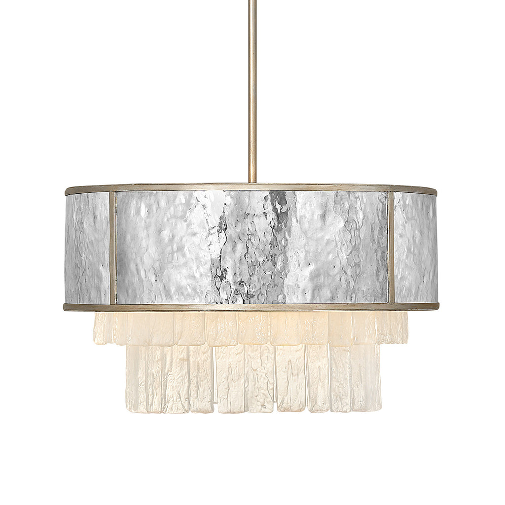 Reverie features a fanciful combination of finishes and shapes to create an opulent transitional silhouette. The robust, hammered stainless steel drum encompasses the textured crystal accents, which create a stunning profile from below. Metal binding adds an artisan touch that completes the look.
