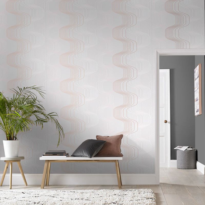 Millennial pink is calmed with soft grey in this design. Revival grey and pink embraces post war revival, with flowing wave designs highlighted with modern metallics.