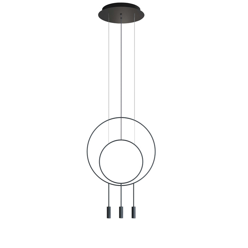 Suspension lamp with a circular body, cylindrical aluminum heads and acrylic (PMMA) lens diffusers. Adjustable height. Includes a decorative sound absorving panel.