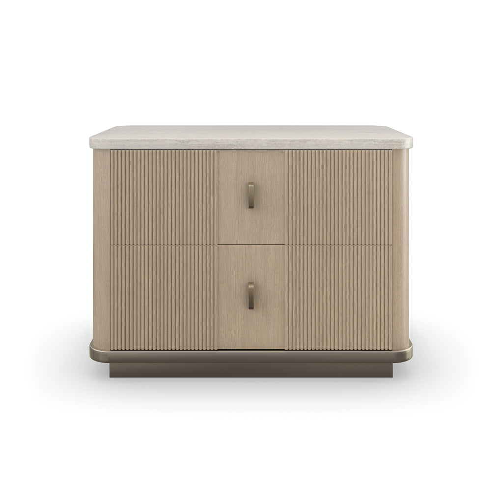 Indulge in the luxurious aesthetic of the Rhythm Nightstand from Caracole. It boasts reeded drawer fronts, rounded corners, and bronze pulls for luxurious appeal. With Linen-painted interiors and wire management, this exclusive piece combines form and function for a perfectly refined bedroom.