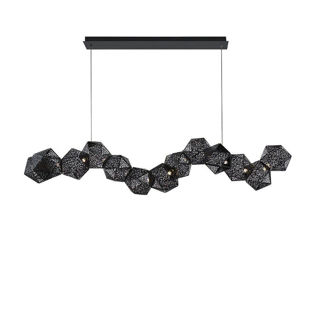 Riddle’s intricate pattern and joinery is no joke. Their expert craftsmen use a special wet-etching process to create a textural motif that looks like a mash up of Sol Lewitt and the complex geometric shapes of Islamic architecture. Inside, an acrylic diffuser shields the high- performance LED modules to create a glare-free illumination, which peekaboo's through the etchings and creates stunning patterns on the nearest surface. A true statement piece with a bold black finish. Available in a pendant or linear chandelier format.