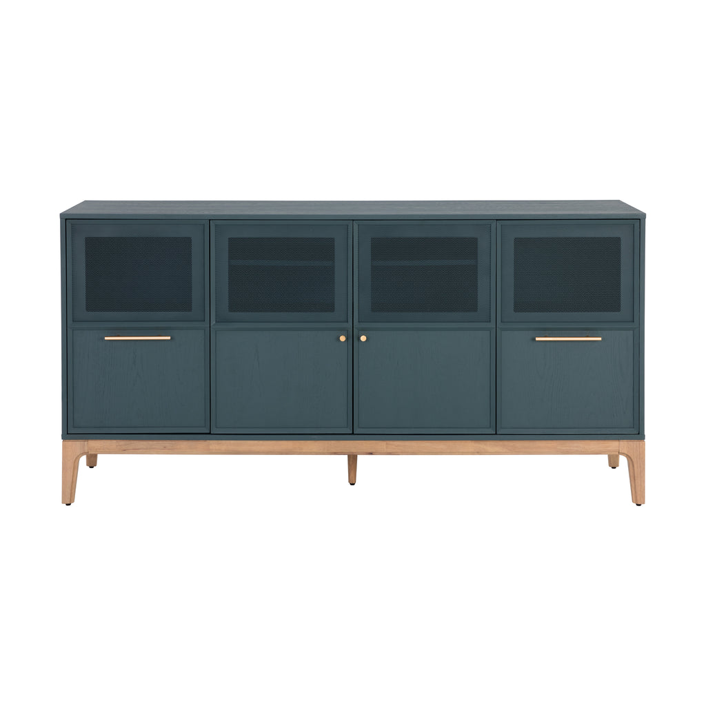 Add a touch of sophistication to your space with the Rivero Sideboard from Sunpan. The teal oak veneer and light wash rubberwood base create a timeless design, while ample storage with gold finish hardware makes it both stylish and functional. Each piece showcases the natural beauty and uniqueness of wood.