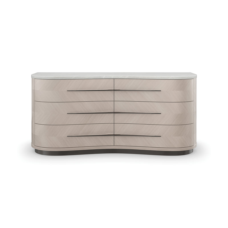 A statement of organic simplicity, the Roam 6-Drawer Dresser from Caracole brings a sleek and sinuous form to the modern bedroom. This beautiful dresser is defined by its gently curving drawer fronts, which are beautifully adorned with chevron-patterned Koto veneers in a soft, pearlescent Moonstone finish. A luxurious marble top provides a durable and elegant surface, adding a touch of natural beauty. For a final, sophisticated touch, the six soft-close drawers are finished with custom horizontal hardware in a Deep Bronze. A fusion of organic fluidity and refined materials, it's a stunning and functional centerpiece for a well-appointed bedroom.