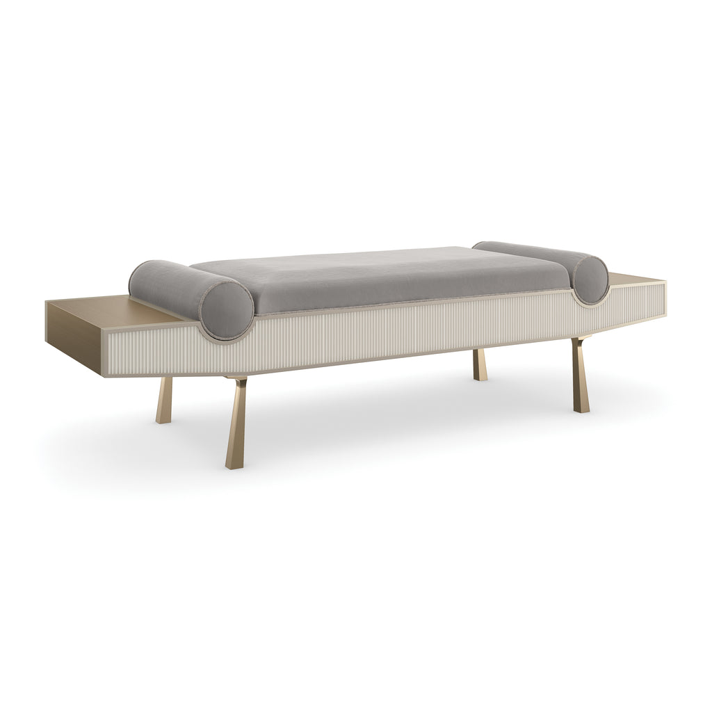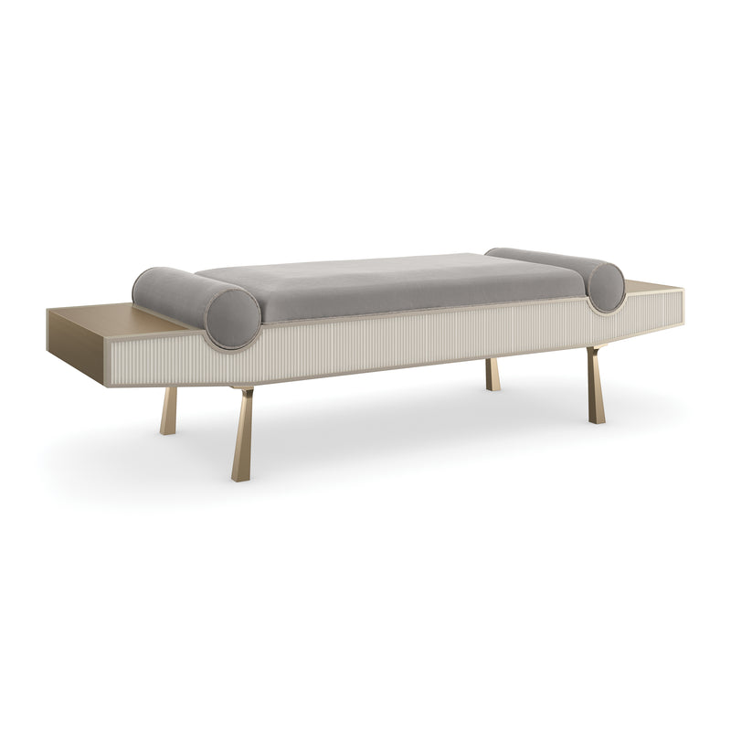 A modern and elegant statement piece, the Roll Play Bench from Caracole is a study in luxurious mixed materials. This streamlined bench is defined by its unique, reeded apron, which is finished in a creamy Almond Milk and brings a sense of rhythm and a striking, textural pattern to the design. The comfortable seat is upholstered in a soft gray mohair fabric and cleverly features recessed bolster pillows and opposing metal wings, perfect for placing a book or decorative object. For a chic finishing touch, the ends are wrapped in a radiant, Brushed Gold metal. A fusion of sophisticated form and thoughtful function, it’s a perfect accent for the foot of a bed or in a grand entryway.