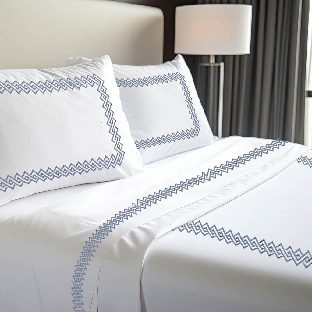 Indulge in the perfect blend of timeless architecture and modern luxury with the Romano Top Sheet from The Lino. Its intricate embroidered border adds a touch of sophistication to any bedding ensemble. Crafted from 100% Egyptian cotton, this top sheet boasts a luxurious 400-thread count percale weave for a crisp and sumptuously soft feel. Elevate your bedroom with this statement piece today.uni
