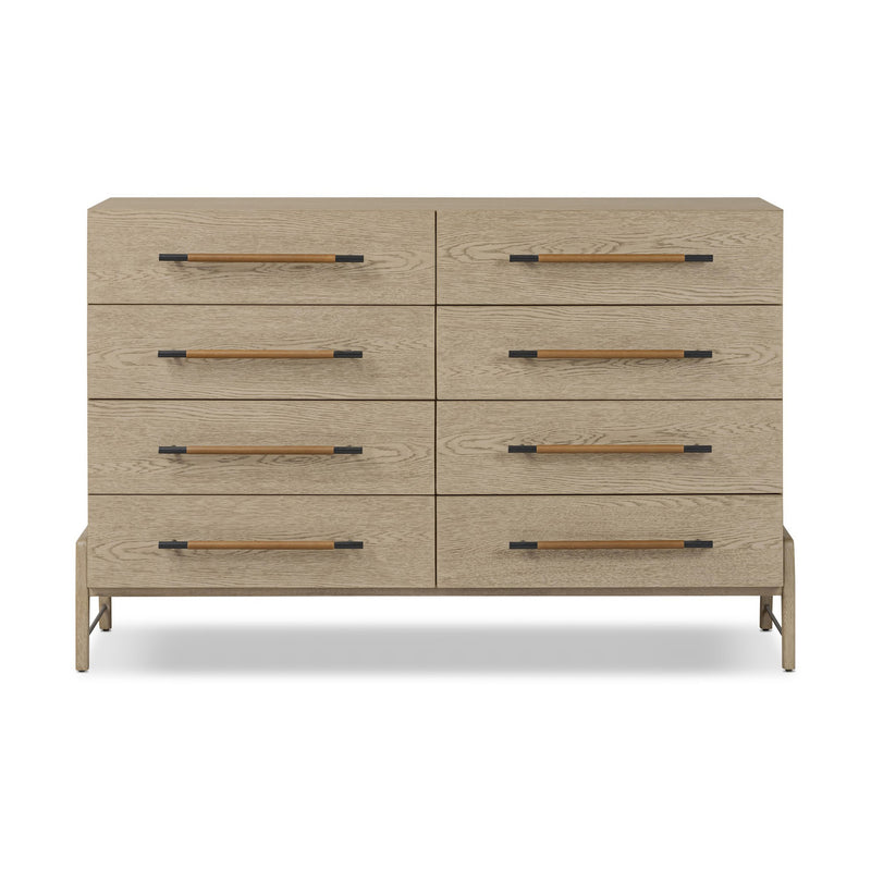 The ultimate combination of functionality and beauty, the Rosedale 8 Drawer Dresser from Four Hands boasts a sleek design and ample storage. Its precision glides and top-grain leather pulls make for a luxurious experience, while the symmetrical arrangement and horizontal grain offer a sense of sophistication. Elevate your bedroom with this stunning piece.