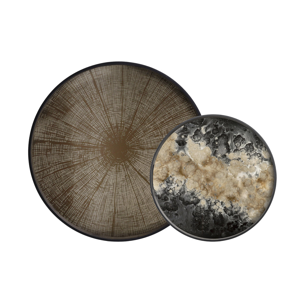 The Round Tray from Ethnicraft, designed by Dawn Sweitzer, combines hand-painted glass with dark FSC-certified wood rims to create a striking contrast. Its abstract patterns and gold accents bring a refined, contemporary elegance to any setting, while the warm hues add a subtle vibrancy. This tray effortlessly blends modern artistry with natural materials, making it a sophisticated centerpiece for your home or office.
