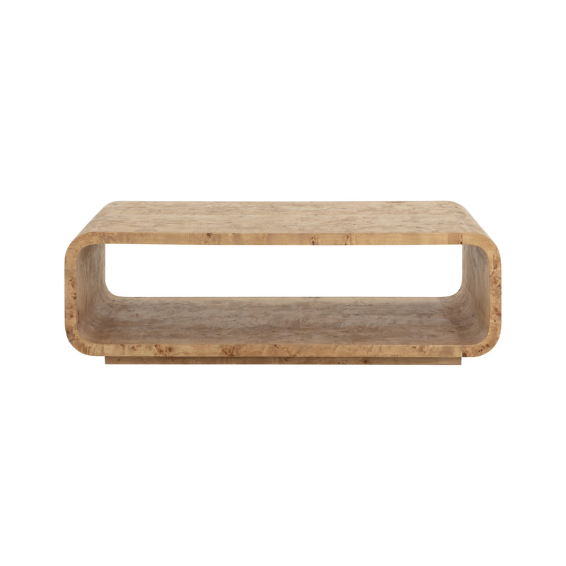 The Rowena Coffee Table from Sunpan embodies the essence of contemporary design through its harmonious balance of fluid contours and architectural precision. This distinguished piece showcases the extraordinary visual complexity of burl veneer—each table presenting a unique topography of swirling patterns and rich dimensional character that cannot be replicated. The meticulously crafted silhouette, with its elevated proportions and refined profile, transforms the traditional coffee table into a sculptural centerpiece.