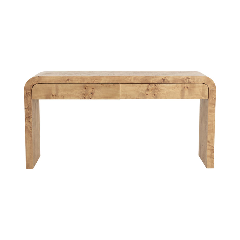 The Rowena Console Table from Sunpan exemplifies contemporary design mastery through its harmonious fusion of fluid contours and architectural precision. This distinguished piece showcases the extraordinary visual complexity of burl veneer—each table presenting a unique tapestry of swirling patterns and rich dimensional character that cannot be replicated. The meticulously crafted silhouette, with its refined proportions and elegant profile, transforms the traditional console into a sculptural statement piece.