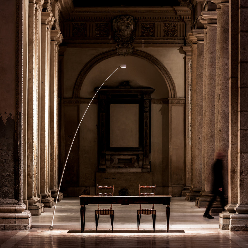 The Sampei LED Floor Lamp from Davide Groppi is a graceful and distinctive piece, designed offering a luxurious touch of sophistication to any space. The sweeping shape evokes a fishing rod, with a pivot atop a low-profile disc and a lamping that captivatingly radiates its warm light. Elevate your home with this elegant, arcing floor lamp, and luxuriate in the exquisite glow of its heightened stature.