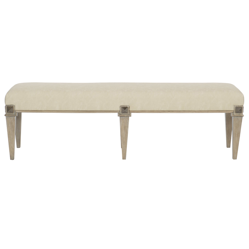 Bernhardt has elevated the bench – the most basic of furniture – to the highest level of elegance and design with this charming six-legged interpretation. Its minimalist style is counterbalanced with gorgeous details to create a cohesive, remarkable accent piece. Its oak legs feature a stainless -steel medallion in a vintage nickel finish at the top of each post. The faux leather performance fabric adds a dimension of timelessness.
