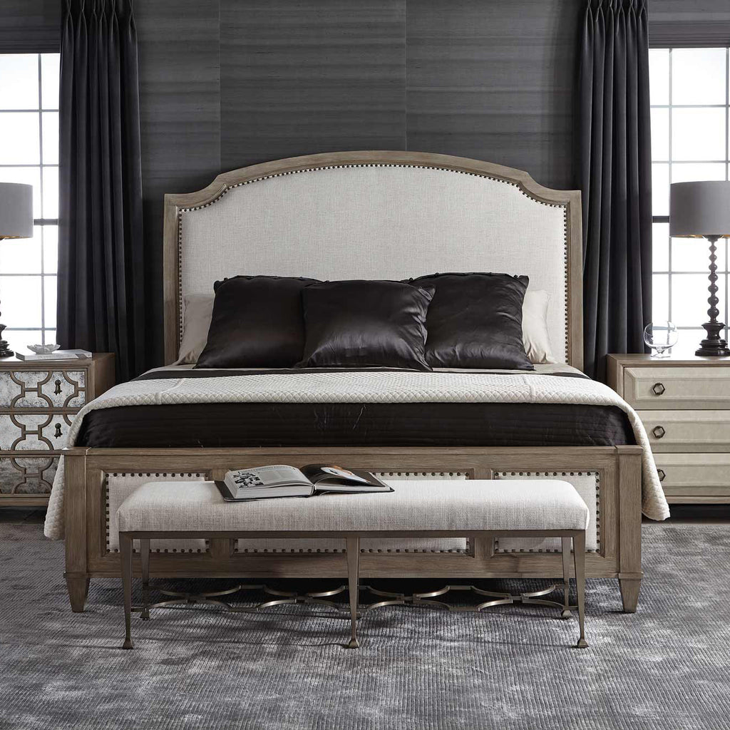 Sink into a dream of California-style relaxation with the Santa Barbara Sleigh Bed from Bernhardt. The modestly curved headboard and geometric footboard are framed in beautiful wood and upholstered with delicate nailhead trim for a luxurious finish. Top with your favorite mattress for a relaxation destination that can't be beat.