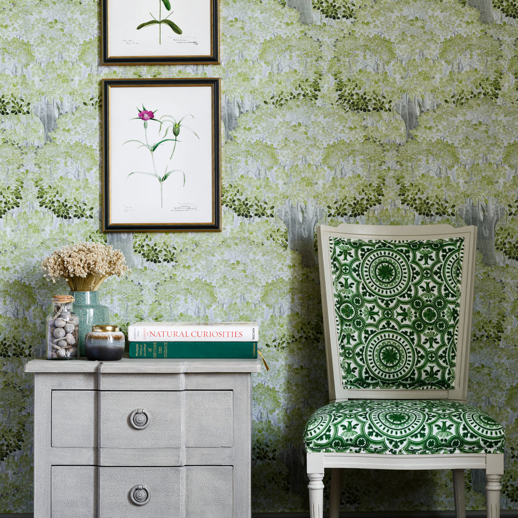 A beautiful hand colored wallpaper design showing detailed leaves and branches of a secular oak tree. The beauty of this stylish design comes by the richness of the green shades.