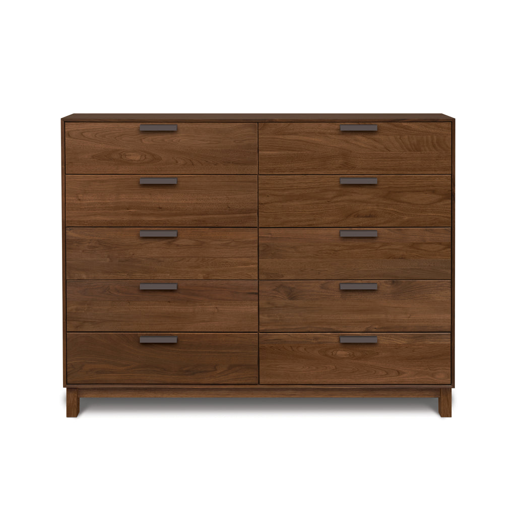 A masterpiece of organization and minimalist design, the Savoy 10-Drawer Dresser from Copeland Furniture is the ultimate storage solution for the modern bedroom. This commanding wide dresser is crafted by hand from solid American black walnut, showcasing the natural beauty and unique grain of the wood. The sleek, low-profile design features ten spacious drawers, providing an unparalleled amount of organized space for your entire wardrobe. A fusion of masterful, time-tested joinery and a silky, GREENGUARD Certified finish, it’s a stunning and healthy addition to any contemporary bedroom.