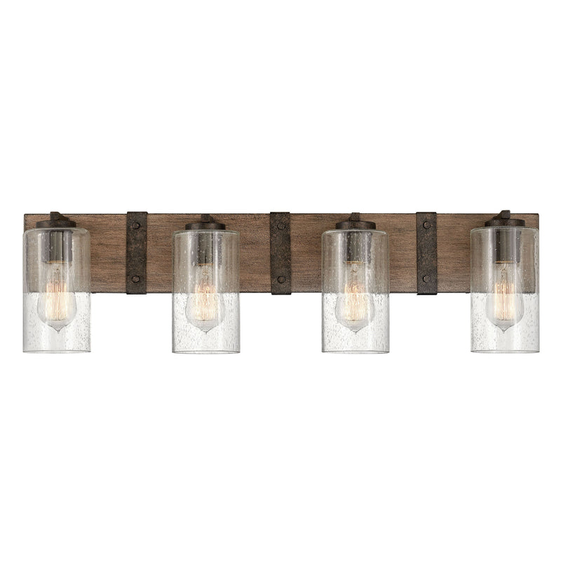 The fresh, rustic design of the Sawyer collection will enhance any living experience with a warm, cozy ambiance. The warm Sequoia wood finish is paired with Iron Rust accents and clear seedy glass for a farmhouse chic style.