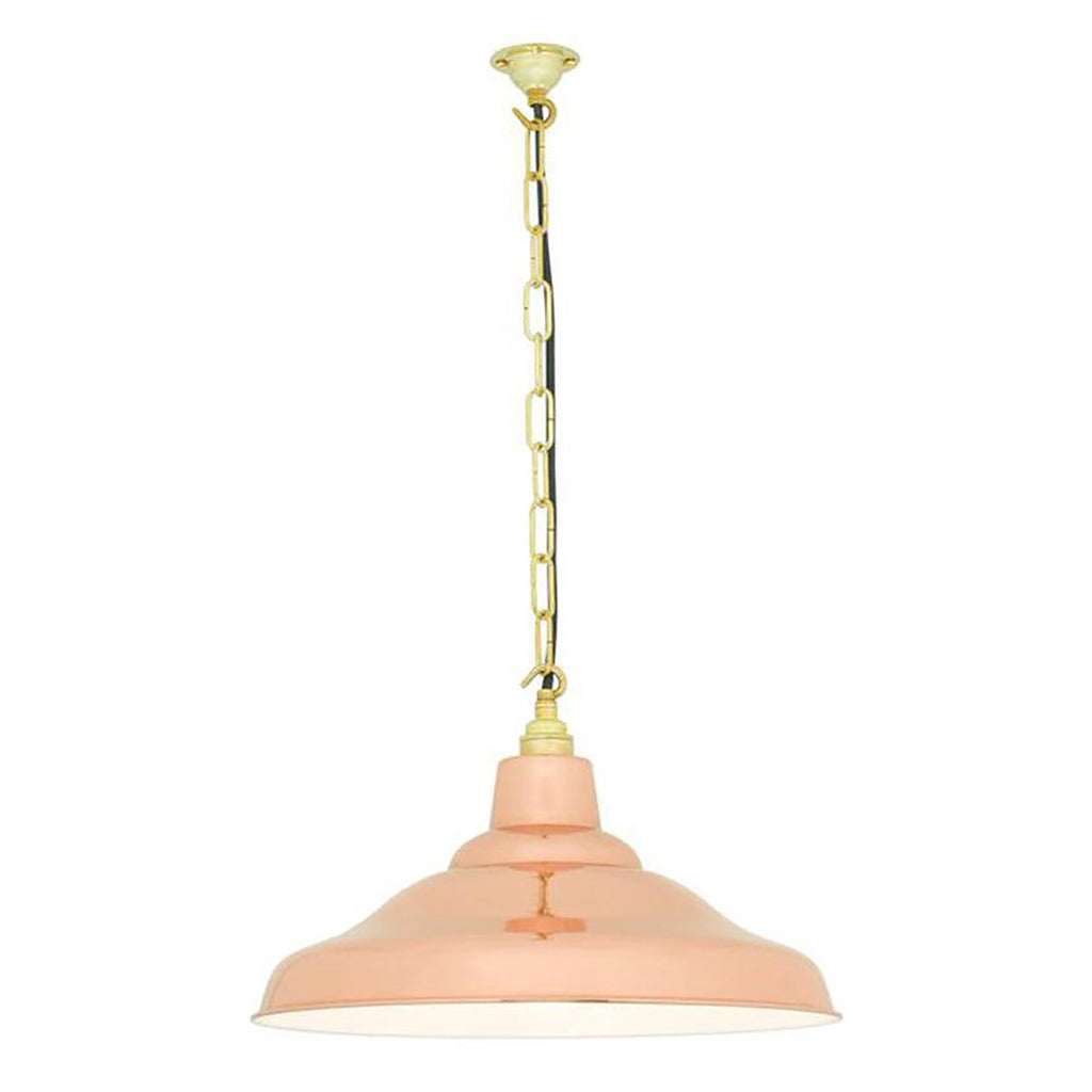 Spun School type light available in either aluminum or copper. Solid copper can be painted green or copper lights with white interiors. The classic shape and look allow these pendants to be used in various types of décor styles. Use them alone or in multiples over counters, tables, bars for direct ambient illumination.