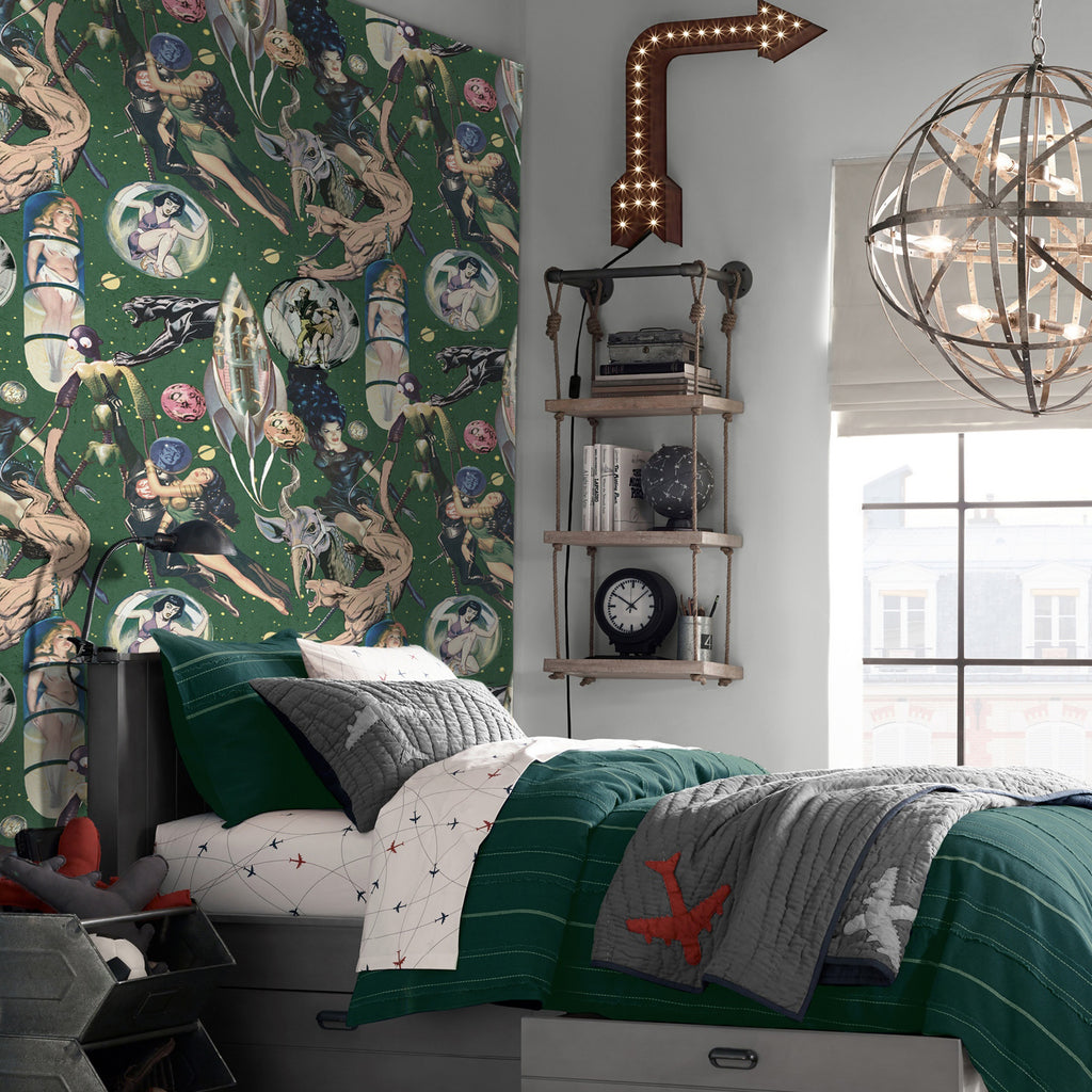 Featuring retro re-makes of typical space opera characters, the Sci-Fi Comics Wallpaper from Mind The Gap brings some intergallactic flair to your favorite interiors. Showcasing bold colors and vibrant images from far corners of the galaxy, this eye-catching wall covering is perfect for adding a pop of unexpected pattern to an office, bedroom, or powder room.