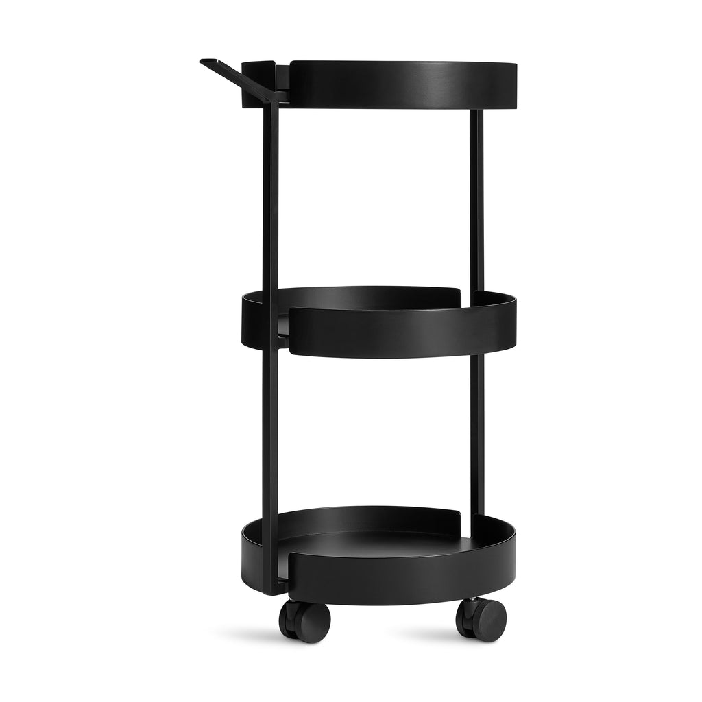 Elevate your organization game with the Scoots McGee Cart from Blu Dot. Crafted from powder-coated steel, its multiple tiers offer ample storage space while the pan-like handle provides a comfortable grip. Smooth casters ensure smooth transportation of your belongings. A sophisticated and exclusive solution for your storage needs.