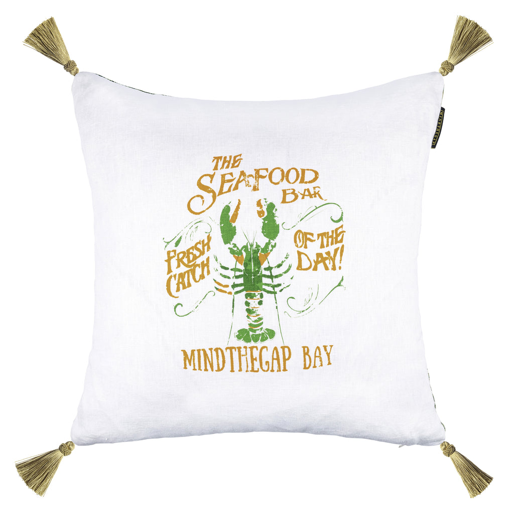 Inspired by the lifestyle of the Caribbean seaside, The Seafood Bar cushions shows a large vintage seafood bar sign screen printed on the front side and Madagascar linen fabric on the back side. The cushion is finished with golden tassels and comes with 100% duck feathers filling.