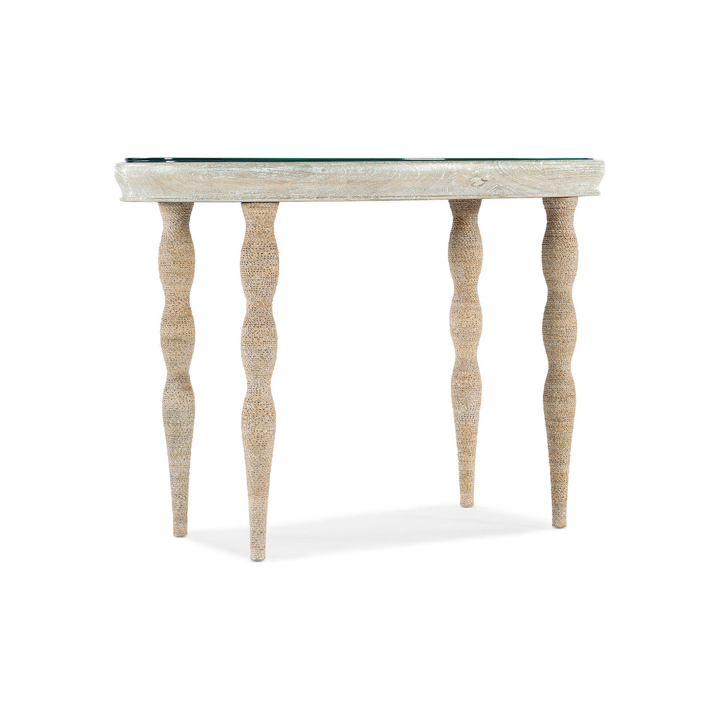 Transform your home into a tranquil oasis with the Serenity Shoal Writing Desk from Hooker Furniture. Crafted with oak veneers, this oval-shaped desk features whitewashed rope-wrapped legs and a painted glass top in ocean blue and gold. Designed for comfort and relaxation, it brings the calming textures and colors of waterfront living into your space.