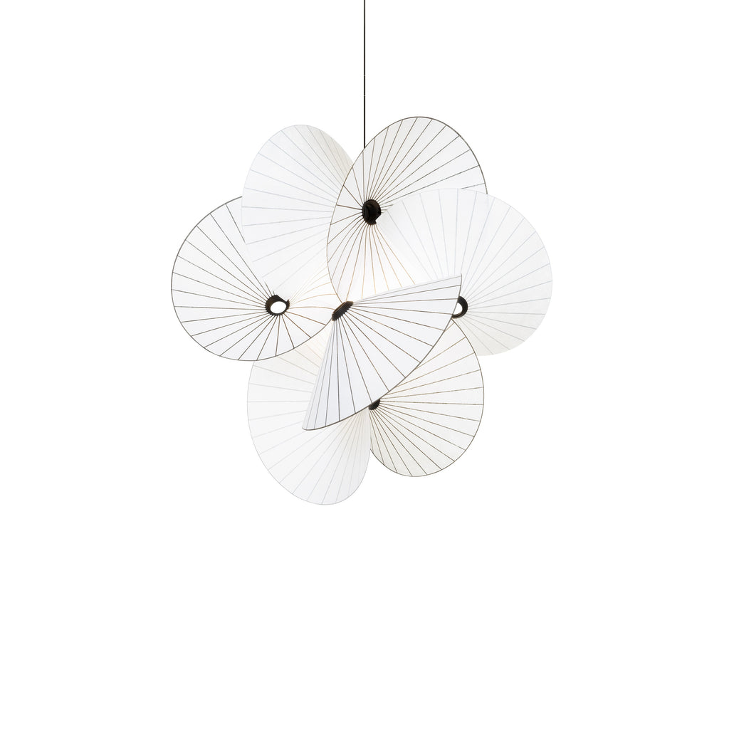 Introduce elegance and movement to your home with the Serpentine Pendant Light from Moooi. Crafted with a beautiful cluster of white fabric shades suspended from the ceiling, each swirl is delicately adorned with thin spindly accents creating enveloping coated steel cocoons. Taking its name from its reptilian inspiration, this pendant creates the illusion of perpetual movement, perfect for adding a statement-making touch above a dining table, desk, or spacious entryway.