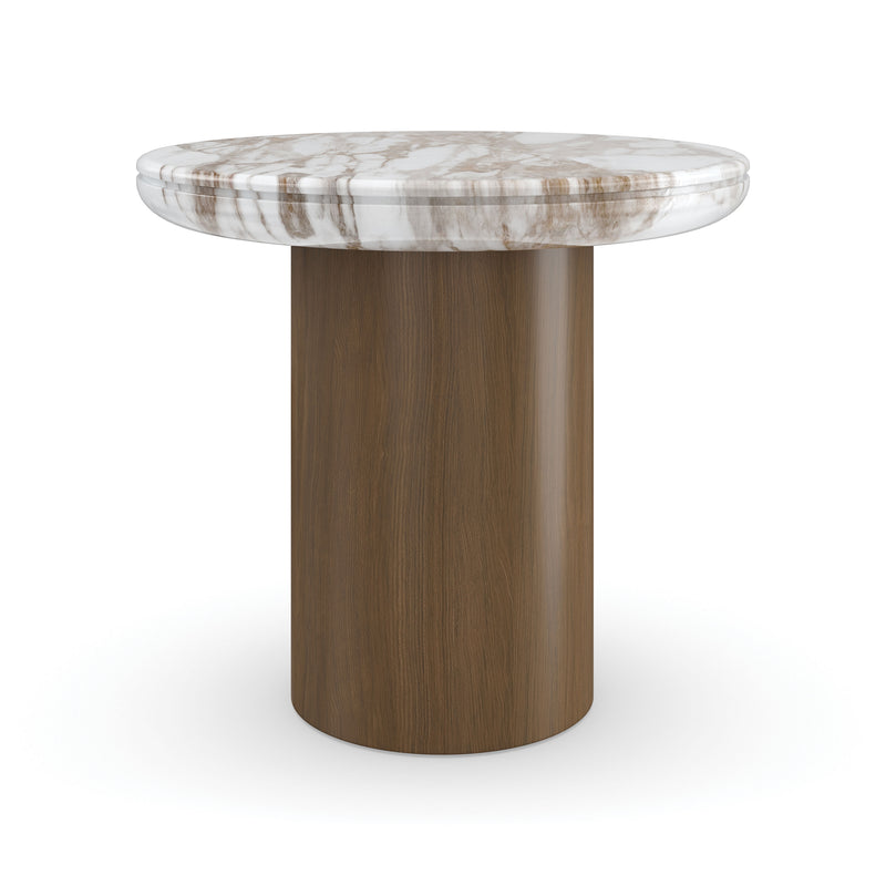 A boldly modern accent designed for ultimate versatility, the Seychelles Round Accent Table from Caracole is an unforgettable statement piece. Its stunning, sculpted Calcutta Oro stone top, with beautiful caramel veining, rests on a rounded base in a rich Retro Walnut finish. While a standout piece on its own, this table is cleverly designed to tuck into a notch on the coordinating Seychelles cocktail table, adding an extra layer of surface and sophisticated dimension. A fusion of organic luxury and thoughtful design, it's a perfect complement to contemporary living spaces.