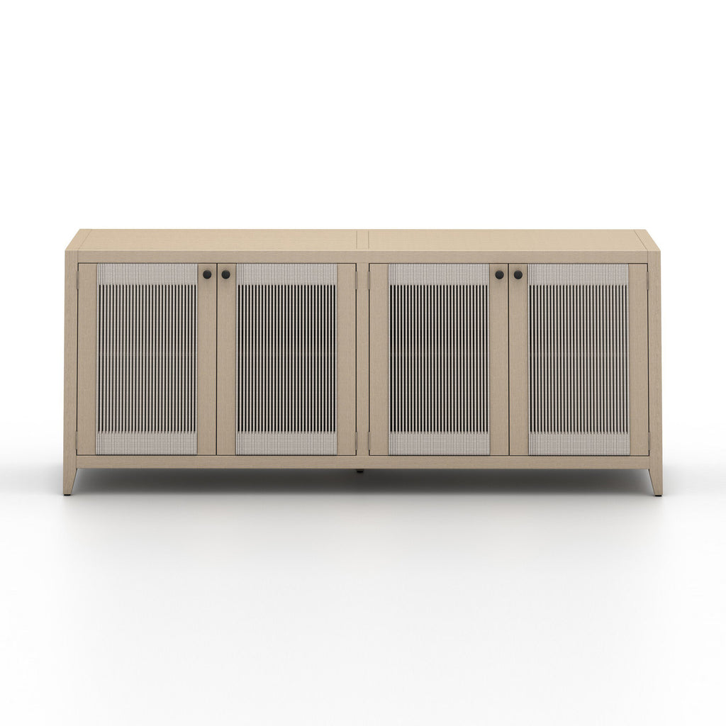 Elevate your outdoor entertaining game with the Sherwood Outdoor Sideboard from Four Hands. Crafted from FSC-certified teak in a weathered grey finish, this sideboard pairs practicality with style. Grey rope detailing adds a touch of texture, giving your space a sophisticated and coastal feel, safely storing your outdoor essentials or entertainment must-haves with ease.