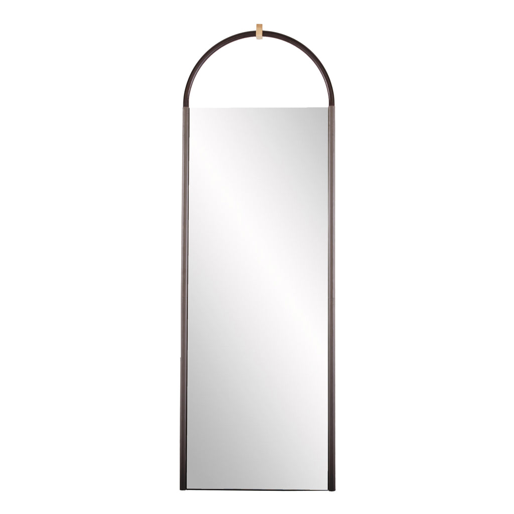 The Shelvin floor mirror unites graceful lines with handsome finishes. The mirror is designed with an arched graphite leather and blackened bronze steel frame with an antique brass accent on top, reminiscent of a delicate arbor, which creates a relief for the mirror set inside. The mirror is fitted with a security cleat for hanging vertically.