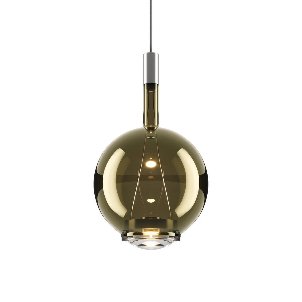 Introducing the Sky-Fall Round LED Pendant Light from Lodes. With its design inspired by ancient glass decanters, this suspension lamp exudes elegance and sophistication. The innovative double LED source provides both direct and indirect light, while the spherically shaped diffuser adds a touch of luxury to kitchens, dining rooms, and living spaces alike.