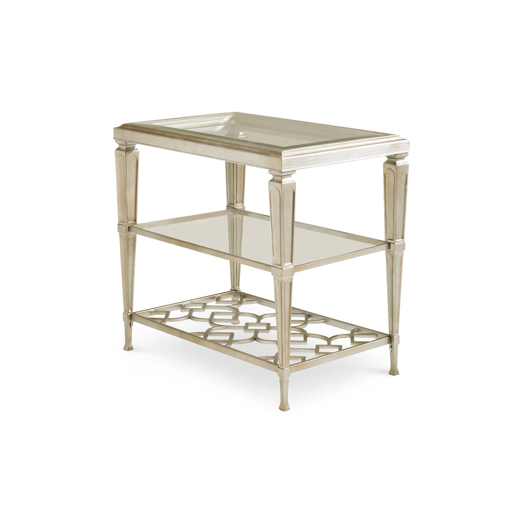 A versatile accent designed to make friends in any decor setting, the Social Connections Side Table from Caracole shines with a sophisticated, matte metallic Taupe Silver Leaf finish. This elegant side table features a clear glass top and a mid-level glass shelf, both showcasing the table's distinctive, interconnecting patterned metalwork below. The warm Taupe Silver Leaf interacts beautifully with a variety of materials, making it a perfect companion for sofas and chairs. A fusion of intricate metalwork and refined style, it brings a touch of understated glamour to any living space.