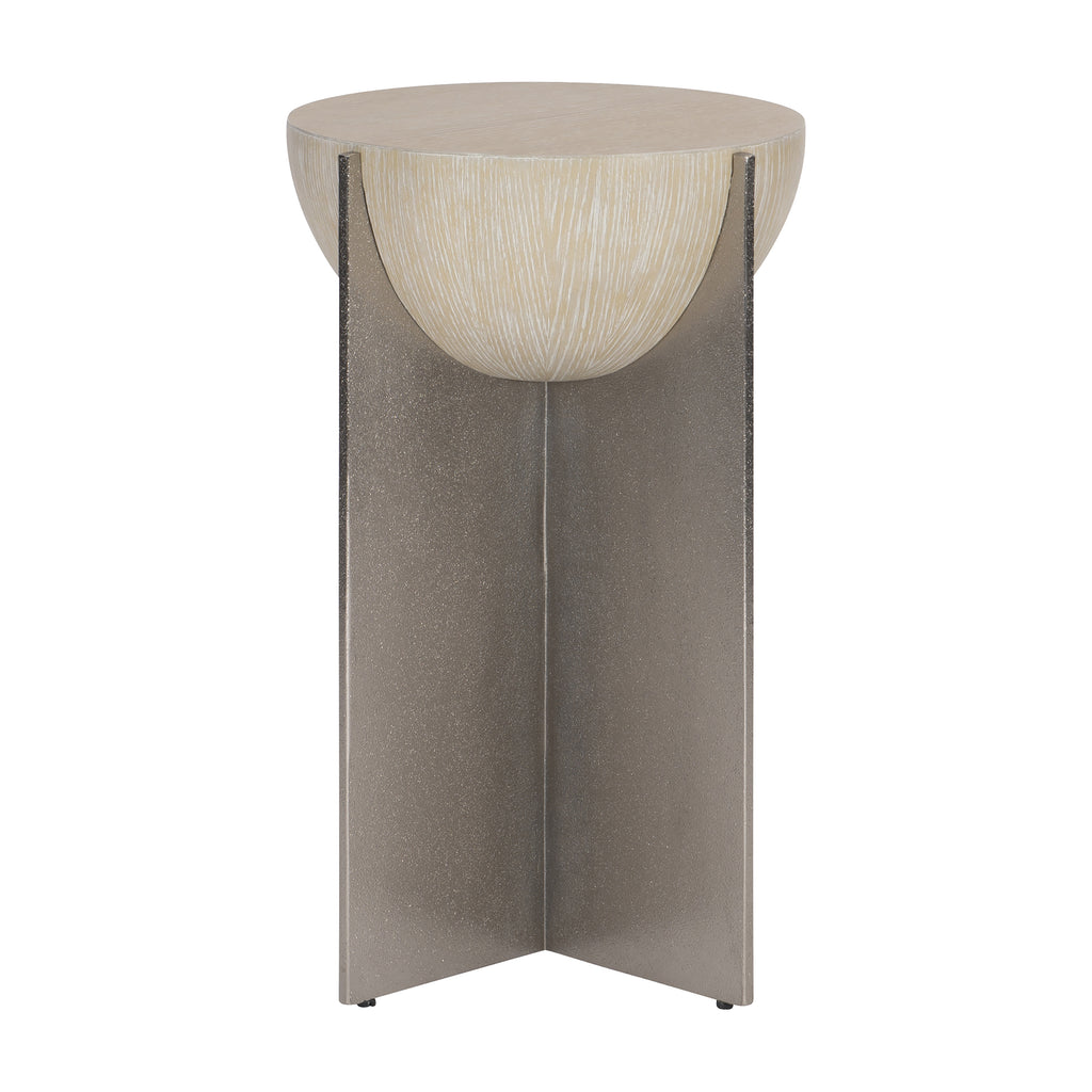 A pedestal of intersecting metal planes forms the unique base on the Solaria accent table. Crafted from cast aluminum in a shiny nickel finish, the base supports a half sphere of cast resin in a Dune finish. The extraordinary merging of geometrics and smooth surfaces define the table’s Bauhaus inspiration.