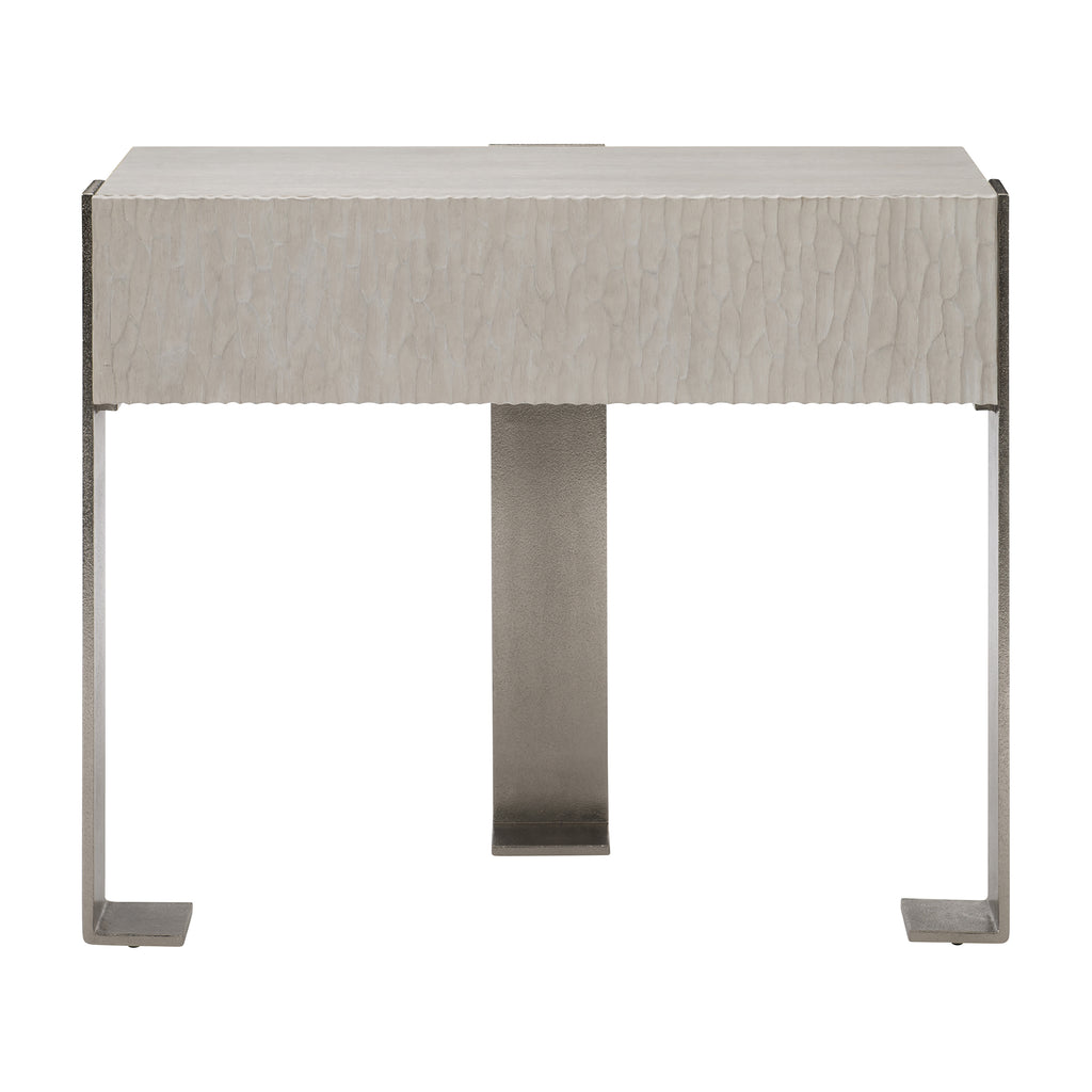 Three cast aluminum supports create a structural tripod, curving to the floor to define the legs of the Solaria nightstand. They encompass a drawer box with a chiseled cast resin front and a Weathered bone finish. A two-port USB charger is located on the upper back of the case.
