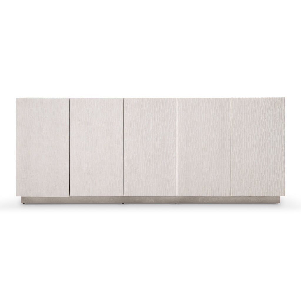Upgrade your living space with the Solaria Entertainment Credenza from Brenhardt. With its functional design featuring cast resin waves and a sleek aluminum plinth base, it effortlessly combines style and storage. Complete with a drawer, shelves, and grommet holes, it's perfect for organizing all of your modern media needs.