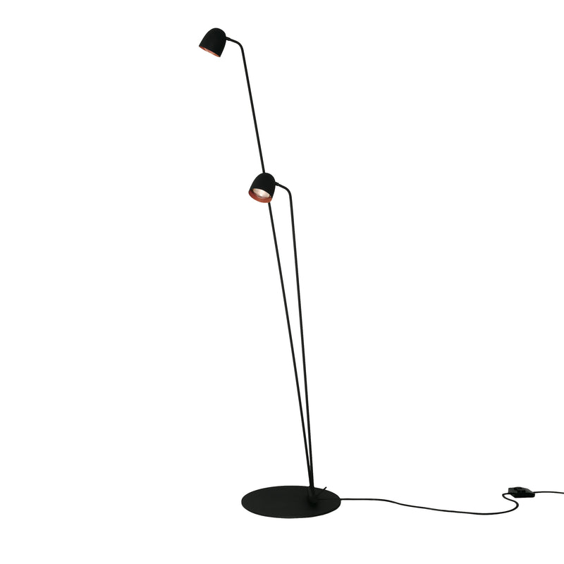 Floor lamp features a double shaft and two heads, both adjustable. The light source is a high-luminance LED bulb, which includes a glass lens that concentrates the light and enhances its output.