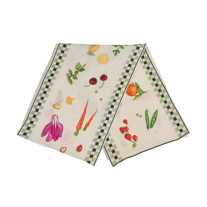 Step into a Renaissance masterpiece with the Still Life Embroidered Double Checker Runner from Misette. Featuring lush fruit and vegetable motifs, this linen runner will elevate your dining experience with its exquisite artistry and timeless elegance. Available in red, blue, or green, it's also 100% machine washable for effortless care and lasting beauty.