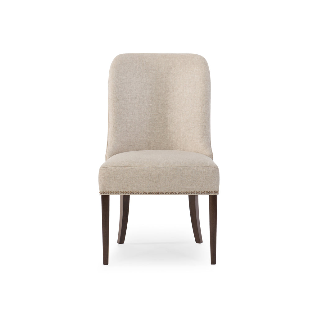 A study in clean, classic lines, the Streamline Dining Side Chair from Caracole brings understated elegance to the modern table. Fully upholstered in a neutral, durable fabric, its simple silhouette offers both versatility and comfort. The chair is supported by graceful, tapered sabre legs, finished in a high-sheen Bourbon Glaze for a touch of refined warmth. Adding a subtle sparkle, a band of brass nailhead trim accents the base, completing this timeless and sophisticated dining companion.
