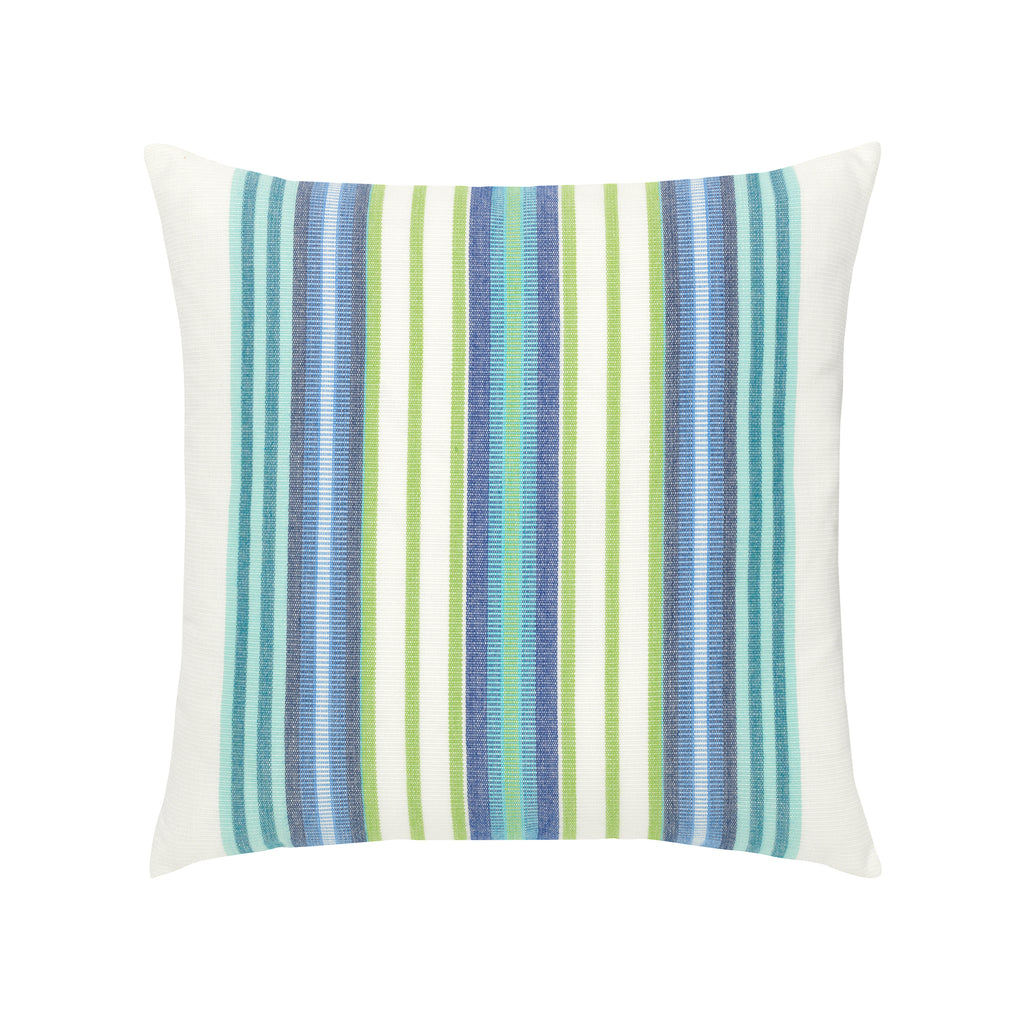 Soft lacey stripes in hues of aqua, cobalt & kiwi on a white ground offer fresh color and texture in an outdoor-safe pillow. Made from Sunbrella yarns, this pillow with resist sun, wind, rain and time.