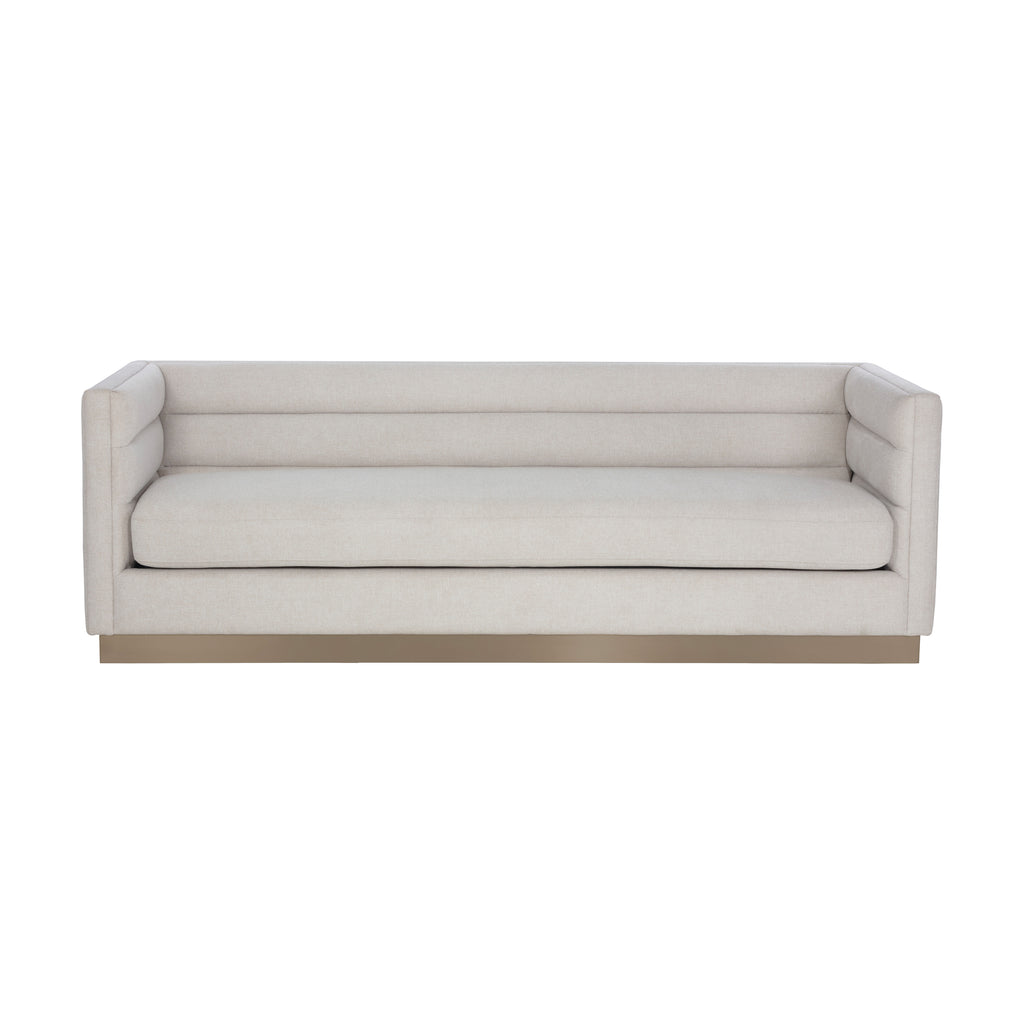 Indulge in sophisticated luxury with the Talbot Sofa from Sunpan. The streamlined design exudes contemporary elegance, while the belfast oatmeal fabric and horizontal tufting offer a touch of opulence. Accompanied by an antique brass stainless steel base, this sofa is the perfect addition to elevate your art-deco or boho chic living space.